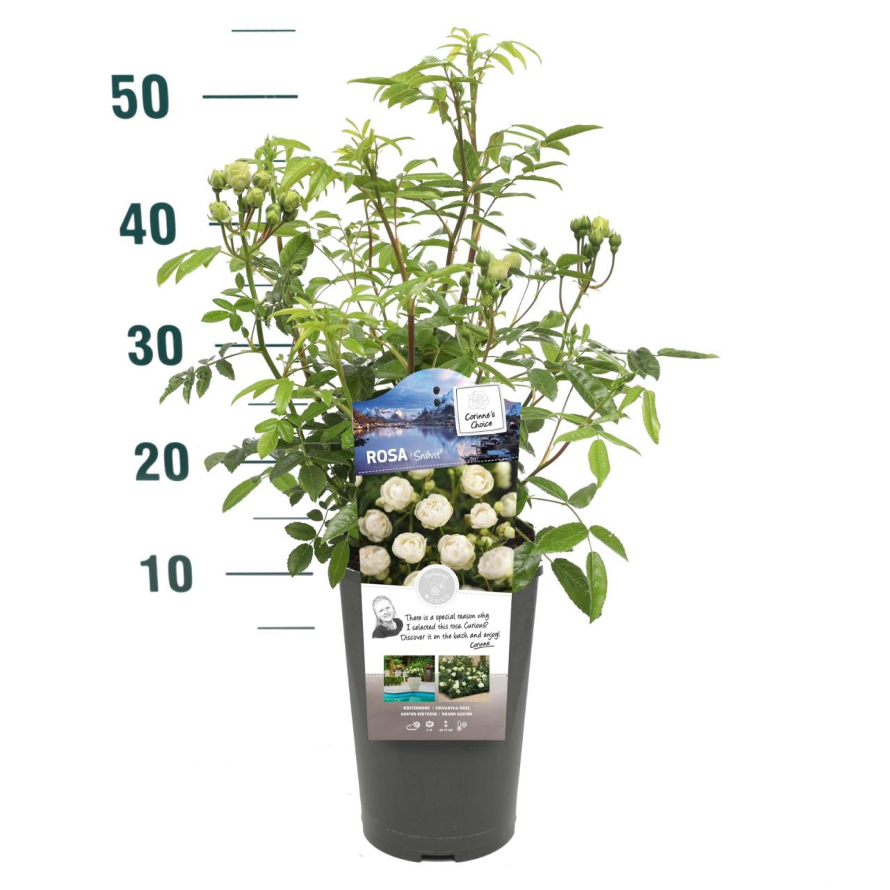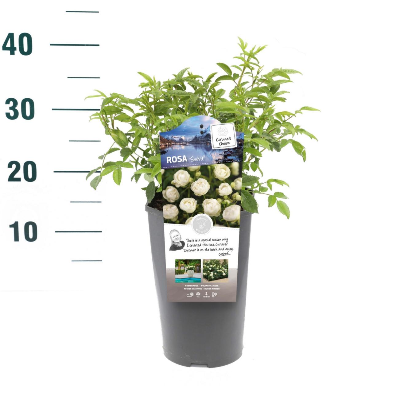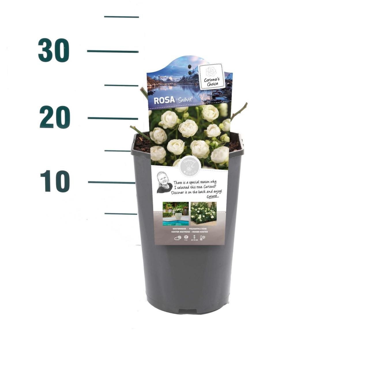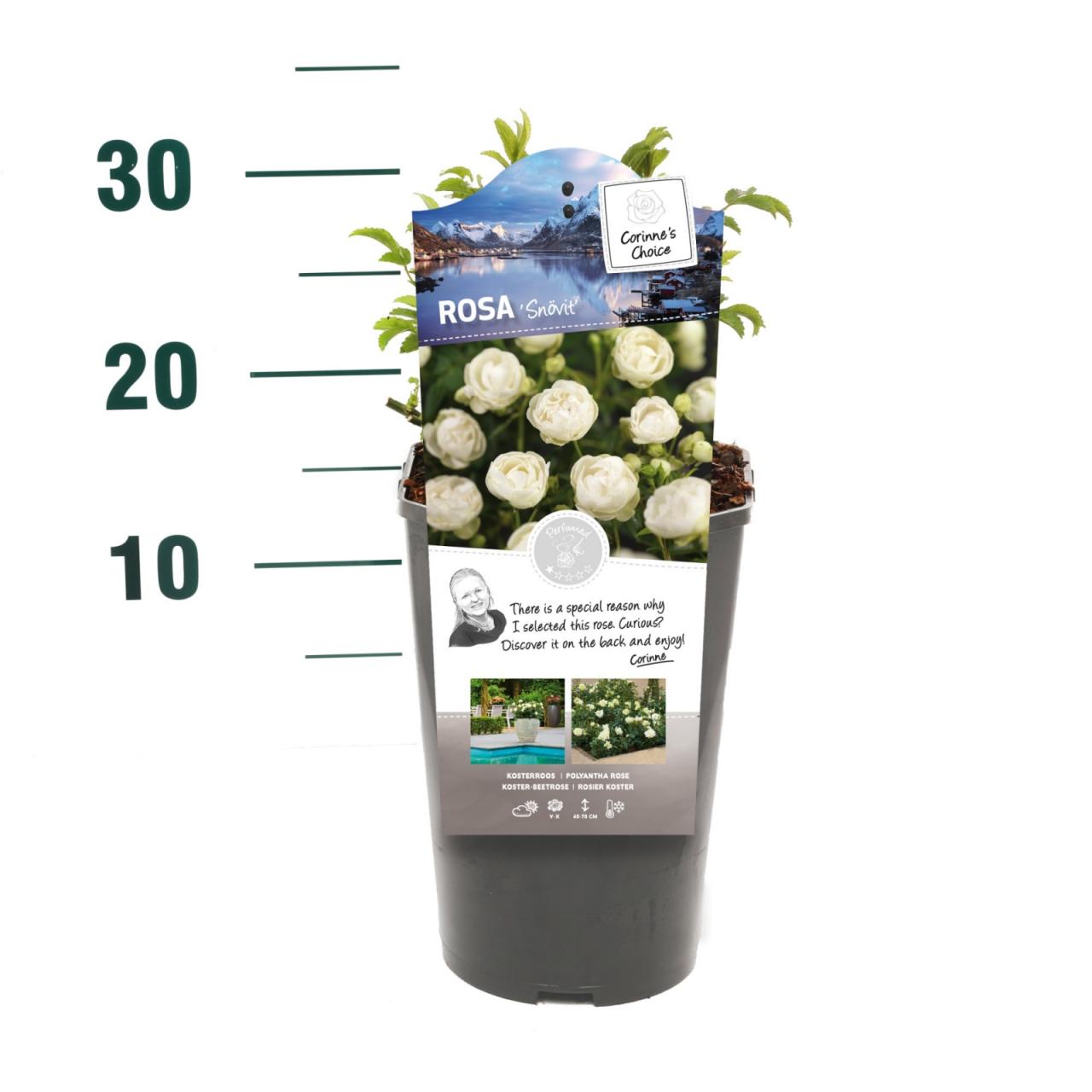 Ruža Snövit cvjeta sitnim, bijelim cvjetovima koji se nikada u potpunosti ne otvaraju. Ovaj mali, uspravni, listopadni grm cvjeta od lipnja do rujna, a cvjetovi su bez mirisa ili samo blago mirisni. Naraste do visine od 40 do 70 cm, a najbolje će uspijevati na punom suncu ili u polusjeni te u dobro dreniranom, vlažnom, humusom bogatom tlu. Najbolje će izgledati posađena u skupinama i na rubovima vrta.