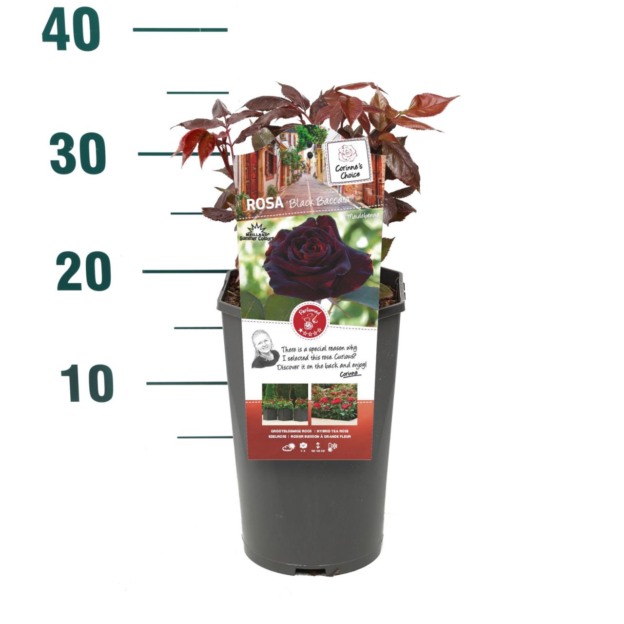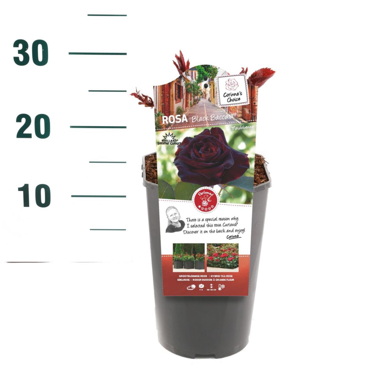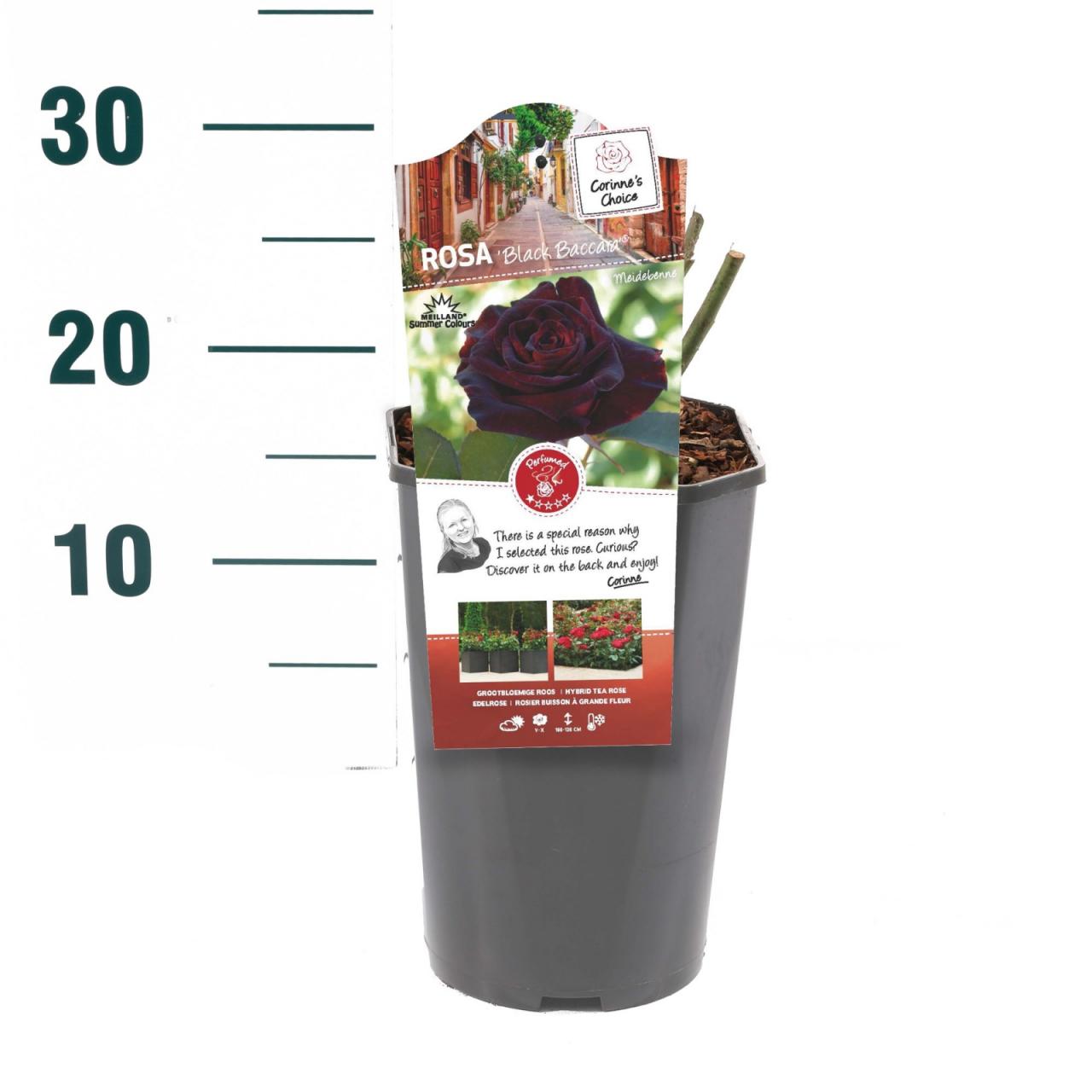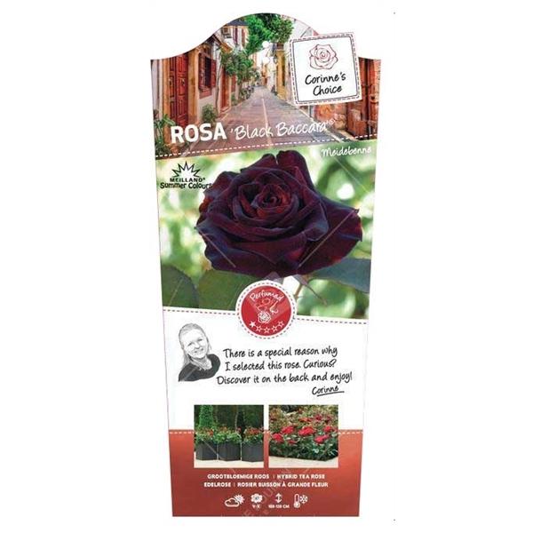 Ruža Crna Baccara je uspravna, grmolika ruža s mirisnim, tamno kestenjastocrvenim cvjetovima koji cvjetaju od ljeta do jeseni. To je kompaktan, lisnati grm s bodljikavim stabljikama i perasto razdijeljenim, tamnozelenim, sjajnim listovima. Dostiže visinu do 1,2 m i širinu do 1 m. Sadi se na sunčanom mjestu u običnoj, hranjivoj vrtnoj zemlji, po mogućnosti tamo gdje ruže prije nisu rasle.